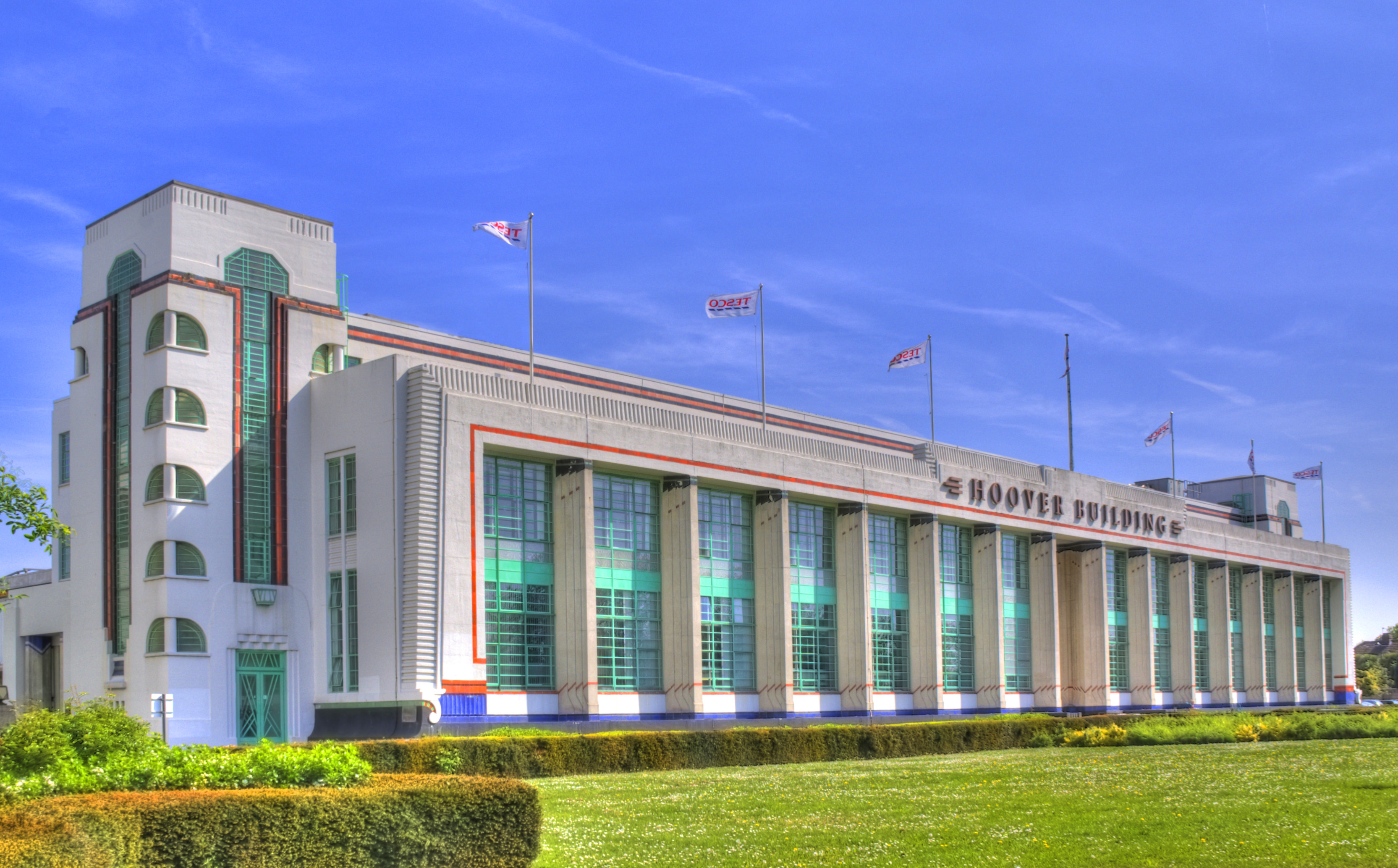 The art deco building was originally built in 1932 and has been enlarged several times during it’s lifetime to include factory premises. Operations largely ceased in 1987 and the building was acquired by Tesco during the 1990’s. The main Hoover Building comprises vacant offices and is now a grade II* listed landmark.