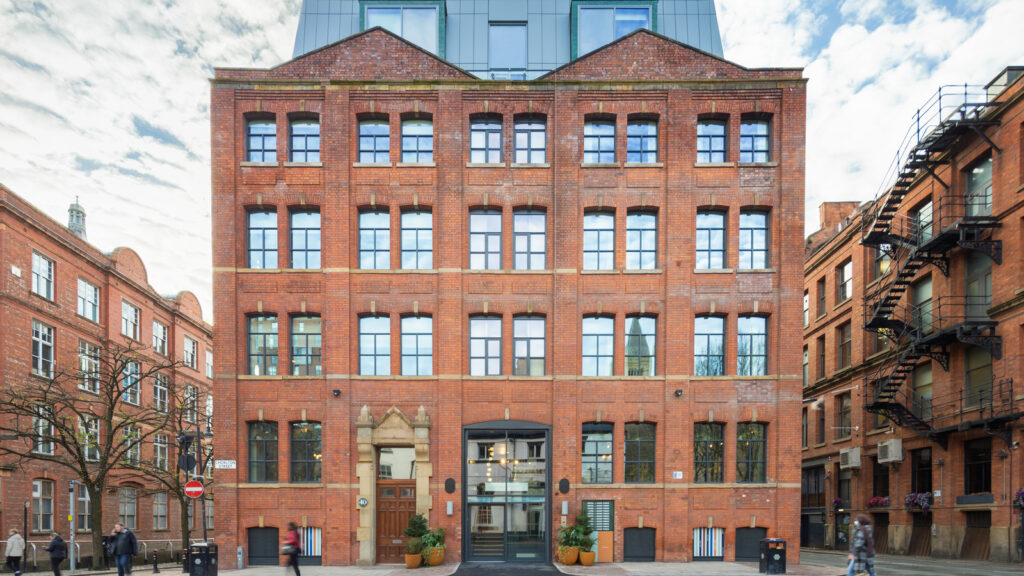 The project at 40 Chorlton Street Manchester is a rooftop extension on a former cotton warehouse and the 2-story extension creates 8 new hotel apartments.